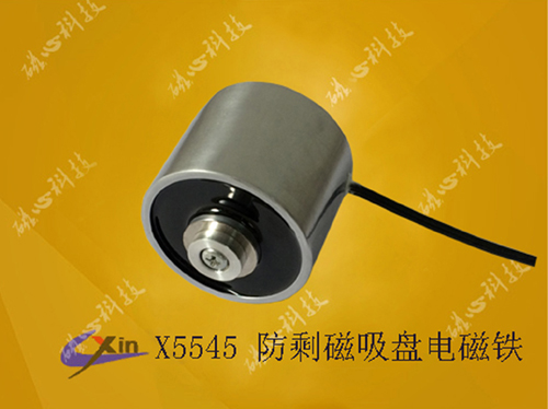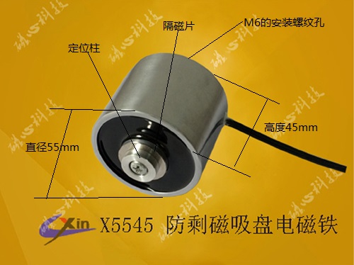 X5545防剩磁吸盤電磁鐵屬于微型直流吸盤式電磁鐵,電磁鐵廠家研發、生產的防剩磁吸盤電磁鐵X5545具有大吸力的同時可以有效的把剩磁降低至5克之內,產品的直徑為55mm,高